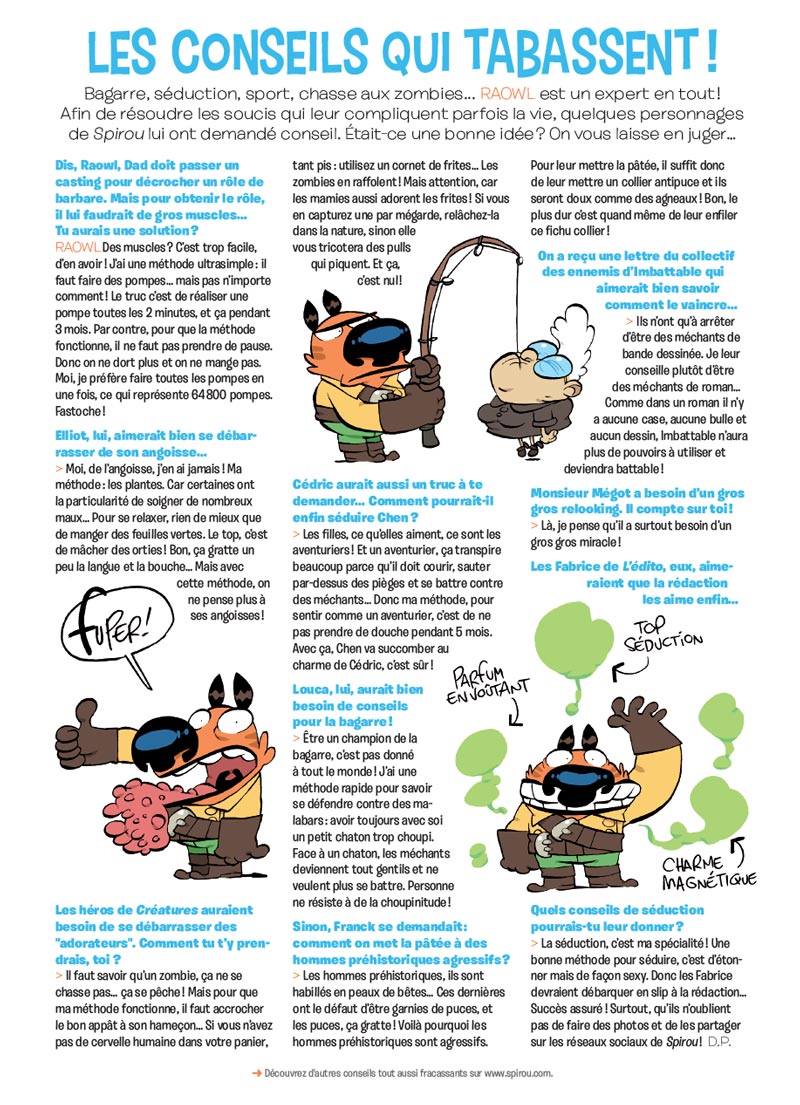 Bagarre, séduction, sport, chasse aux zombies… RAOWL est un expert en tout ! Afin de résoudre les soucis qui leur compliquent parfois la vie, quelques personnages de Spirou lui ont demandé conseil. Était-ce une bonne idée ? On vous laisse en juger…