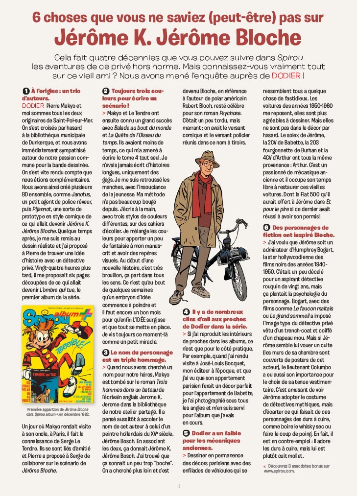Cela fait quatre décennies que vous pouvez suivre dans le journal Spirou les aventures de Jérôme K. Jérôme Bloche. Mais connaissez-vous vraiment tout sur ce détective hors norme ? La rédac a mené l’enquête auprès de Dodier !