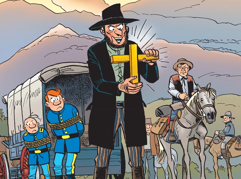 F. Neidhart : Alors, ça, c’est l’une des grandes légendes américaines. Aujourd’hui encore, des chasseurs de trésors le recherchent. Ce mythe a déjà été utilisé au cinéma. Dans Le bon, la brute et le truand, on le retrouve planqué dans un cimetière. En BD, des séries comme McCoy ou Blueberry y ont déjà fait allusion… À ce propos, je vous dévoile un petit secret : les deux confédérés qui trépassent au début de l’histoire s’appellent Carson et Donovan. Carson, c’est le nom du soldat qui meurt dans Le bon, la brute et le truand. Et Donovan, c’est le véritable nom de famille de… Blueberry !
