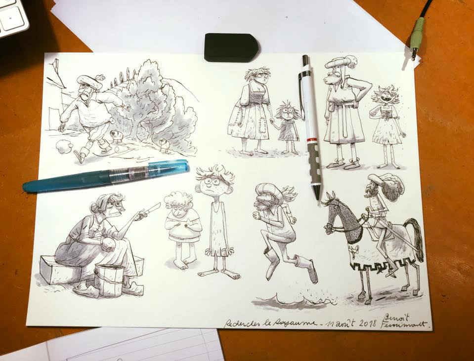 Benoît Feroumont a bien travaillé tout l’été (il est actuellement en pleine ligne droite pour le découpage de l’album) et dévoile quelques recherches et croquis réalisés pour le prochain tome du Royaume.