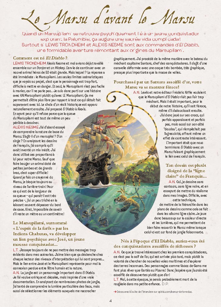 Quand un Marsupilami se retrouve psychiquement lié à un jeune conquistador explorant la Palombie, ça augure une sacrée vida complicada ! Lewis Trondheim et Alexis Nesme sont aux commandes d’une formidable aventure remontant aux origines du Marsupilami, qui démarre cette semaine dans le journal Spirou.