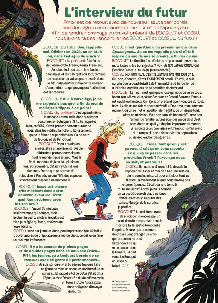 Frnck est de retour, avec de nouveaux sauts temporels, sous les signes entrelacés de l’amour et de l’apocalypse ! Afin de rendre hommage au travail présent d’Olivier Bocquet et Brice Cossu, nous avons fait se rencontrer les Bocquet et Cossu… du futur !