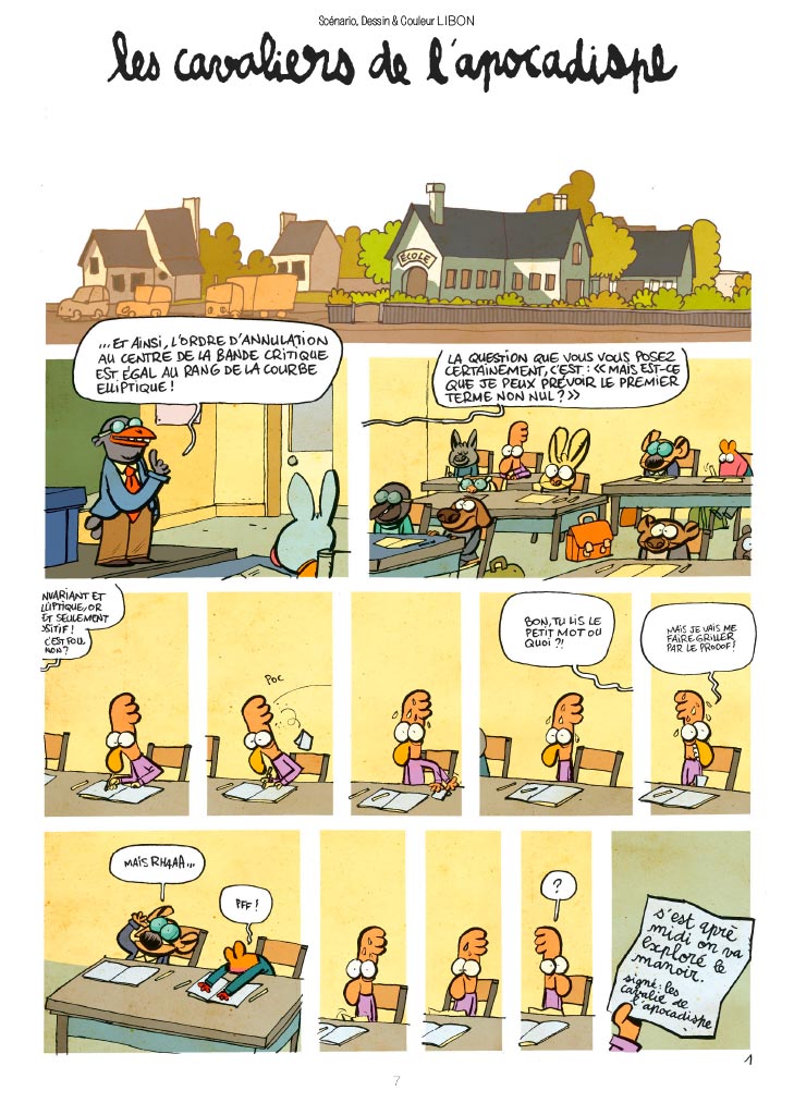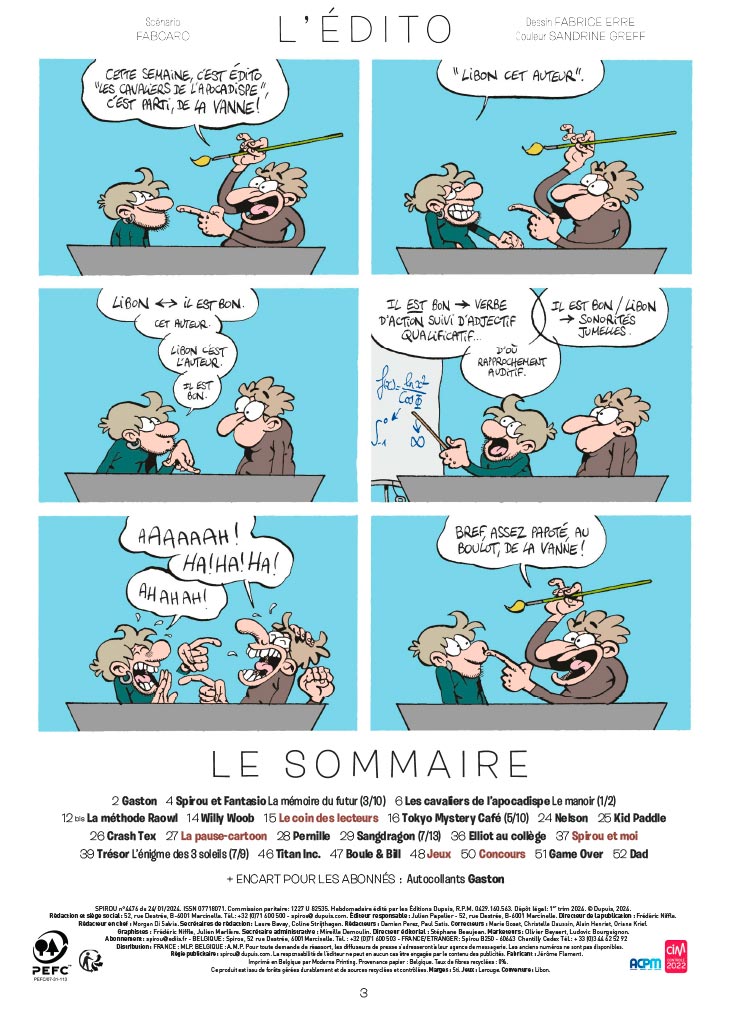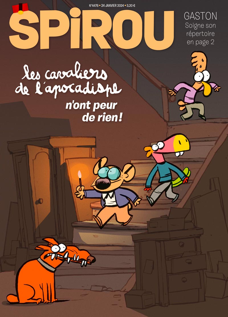 Cette semaine dans le journal Spirou, premier épisode d’une aventure (pas si) inédite (mais quand même !) des Cavaliers de l’apocadispe. « Le manoir », est en effet un mini-récit que Libon a retravaillé et redessiné à l’occasion de sa parution prochaine en album.