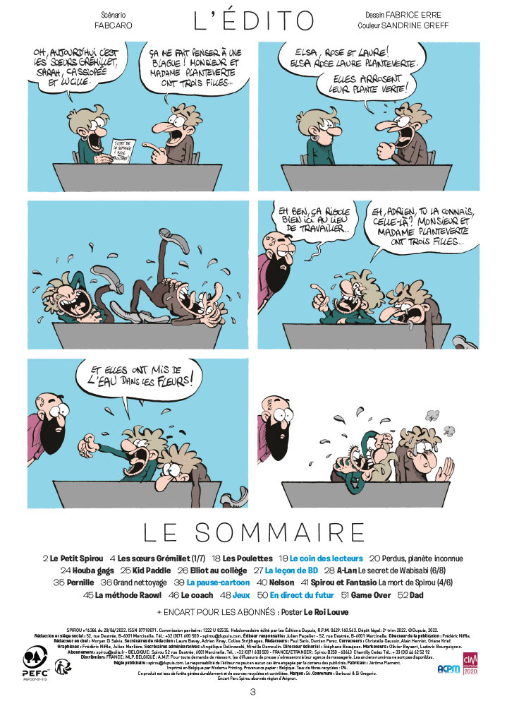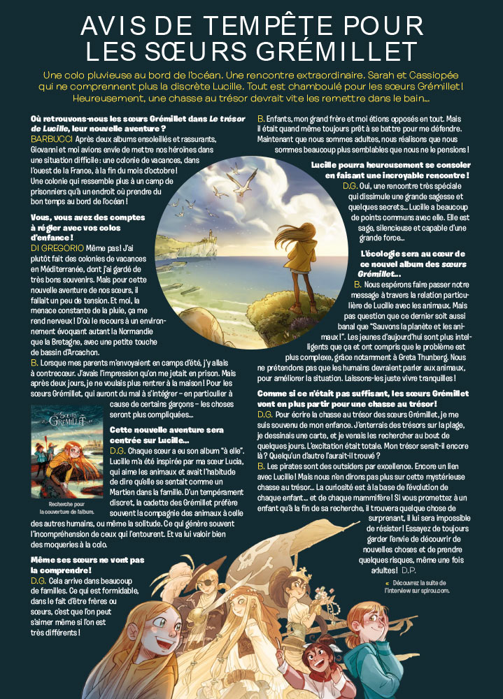 Une colo pluvieuse au bord de l’océan. Une rencontre extraordinaire. Sarah et Cassiopée qui ne comprennent plus la discrète Lucille. Tout est chamboulé pour les soeurs Grémillet qui reviennent cette semaine dans le journal Spirou ! Heureusement, une chasse au trésor devrait vite les remettre dans le bain…