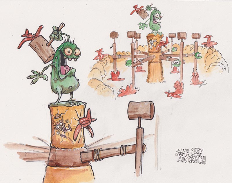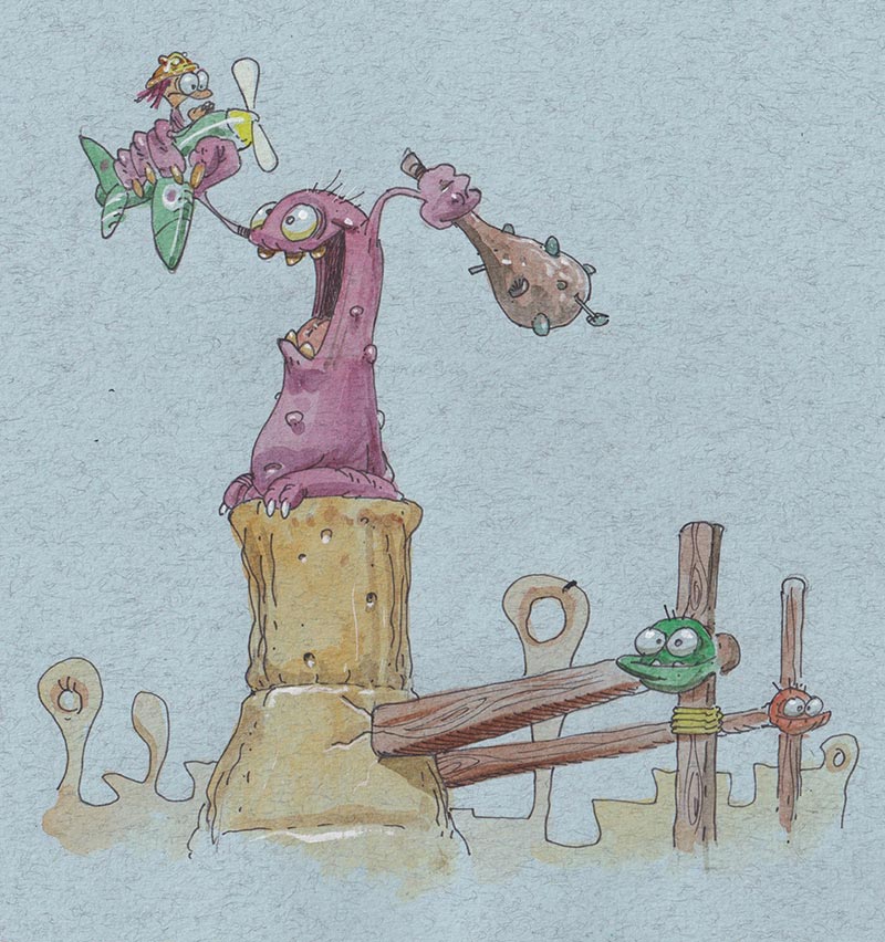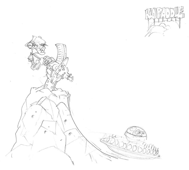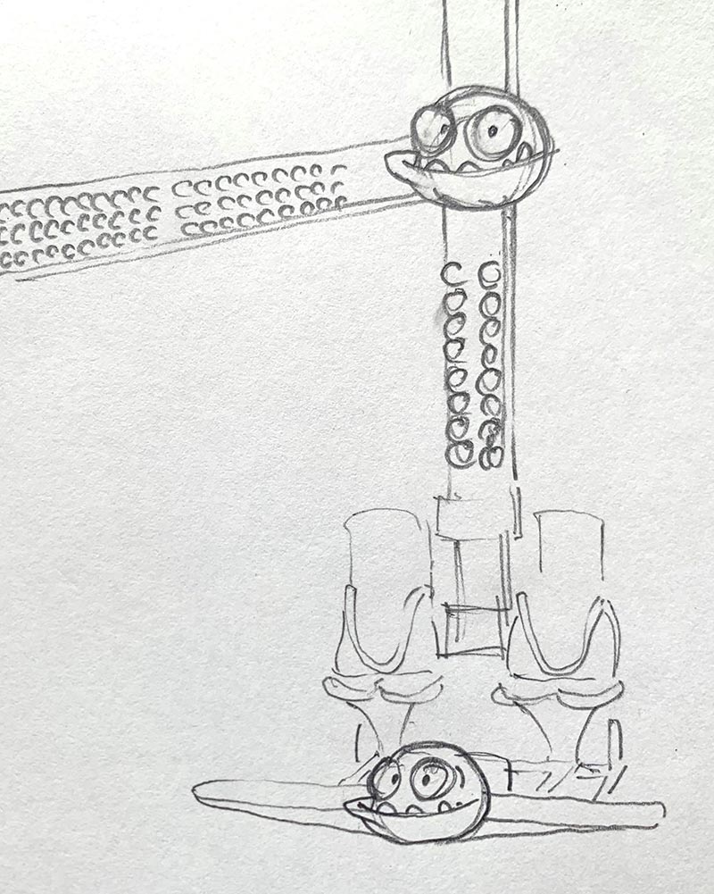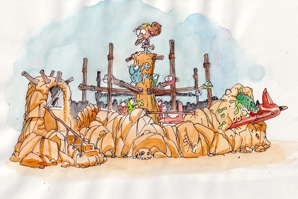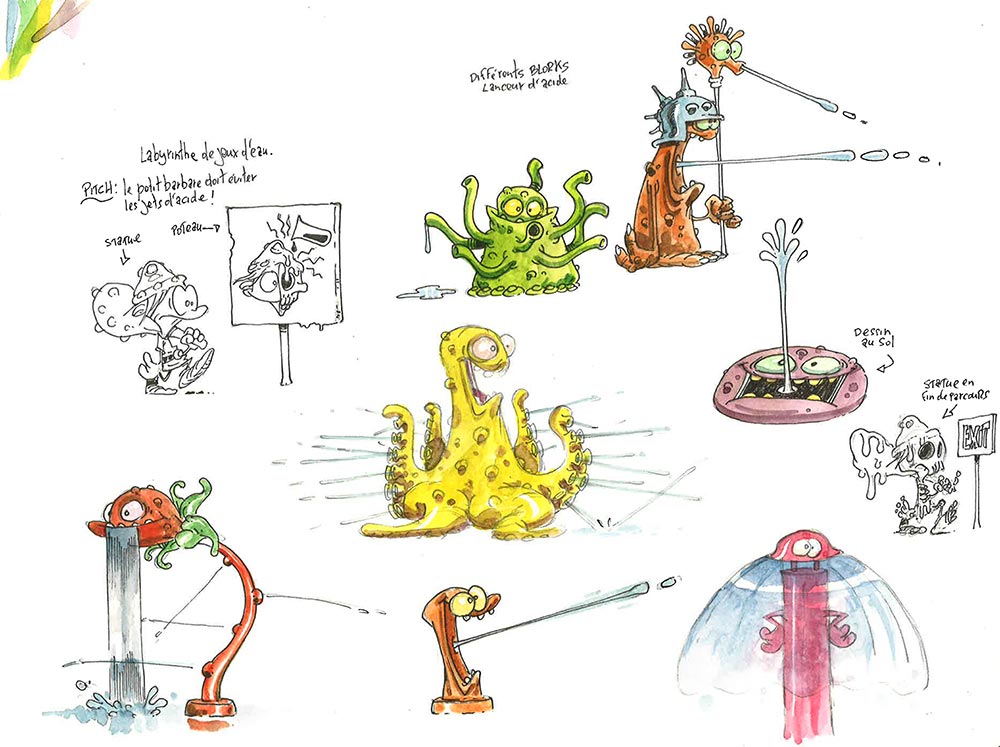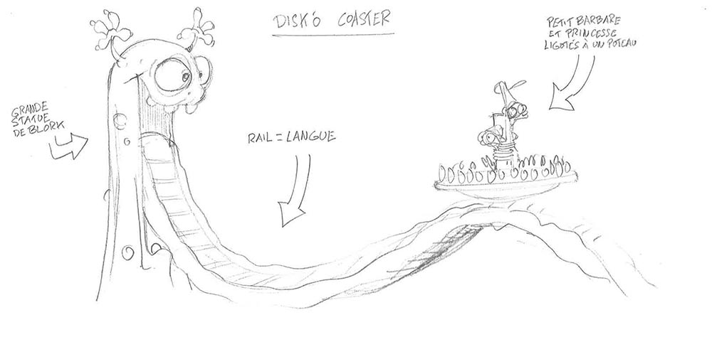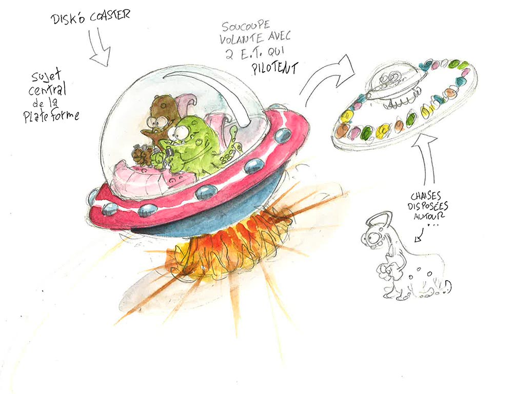D’abord j’essaie de bien comprendre comment le ride fonctionne. Quel sera le moment fort de l’expérience, pour que je puisse y glisser ma patte. Je me mets dans la peau du visiteur qui est sur son roller coaster. Je dessine des trucs, en imaginant des statues géantes, des scènes spectaculaires qui feront rêver les gens ! Pour Crash Blork, l’attraction que j’ai personnalisée, j’ai repris les formes existantes du manège, et j’ai ajouté des personnages, des monstres… Tout en devant faire attention aux règles de sécurité.