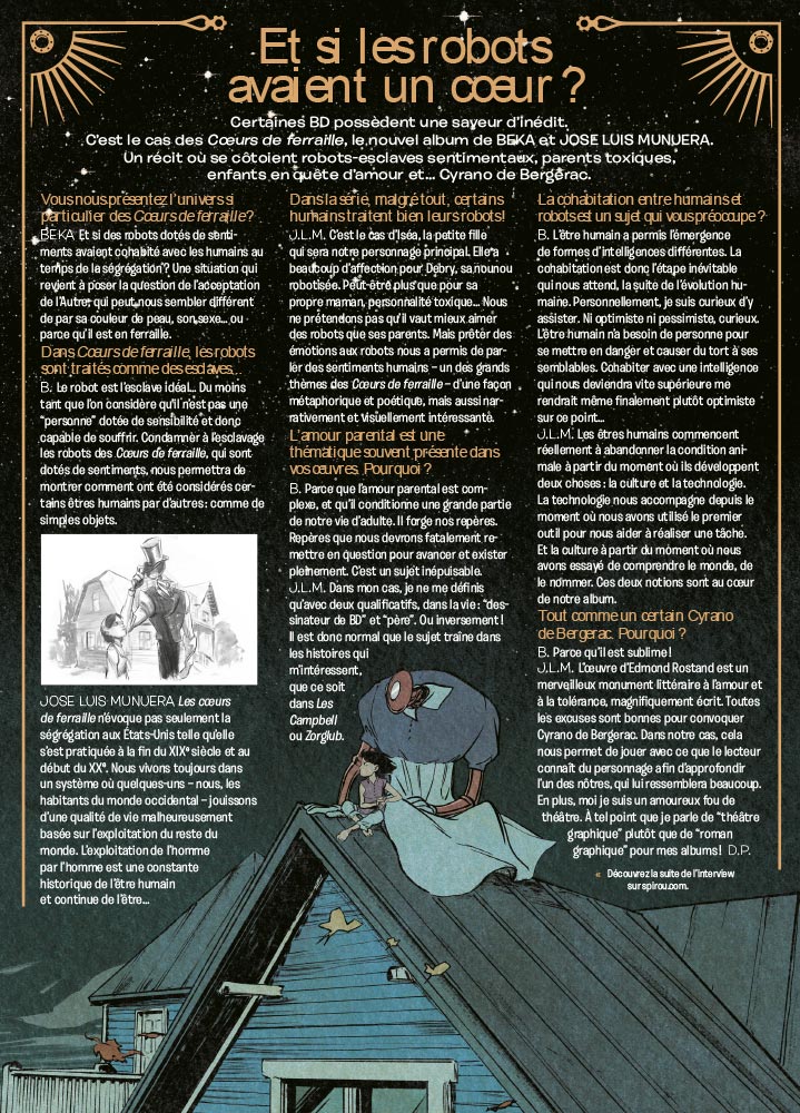 Certaines bandes dessinées possèdent une saveur d’inédit. C’est le cas des Cœurs de ferraille, le nouvel album des BeKa et de Jose Luis Munuera. Un récit exceptionnel, où se côtoient robots-esclaves sentimentaux, parents toxiques, enfants en quête d’amour et… Cyrano de Bergerac.