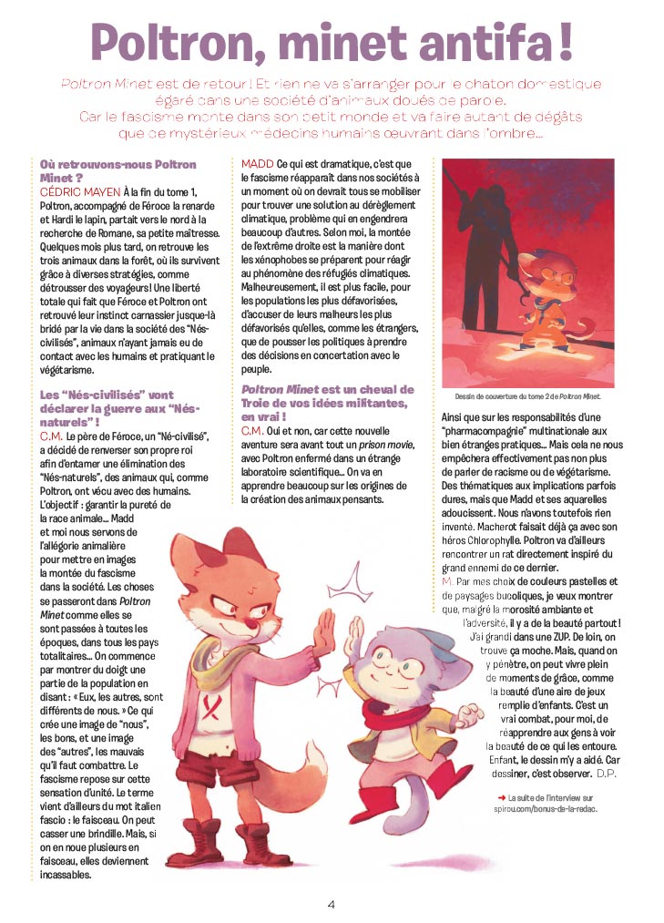 Cette semaine, Poltron Minet est de retour dans le journal Spirou ! Et rien ne va s’arranger pour le chaton domestique égaré dans une société d’animaux doués de parole. Car le fascisme monte dans son petit monde et va faire autant de dégâts que de mystérieux médecins humains œuvrant dans l’ombre…