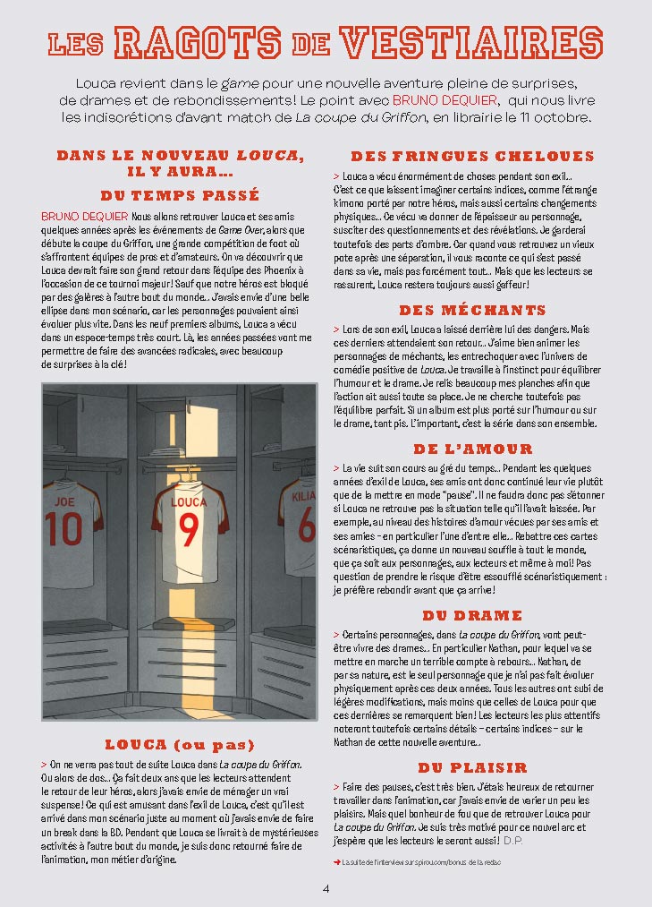 Cette semaine dans le journal Spirou, Louca revient dans le game pour une nouvelle aventure pleine de surprises, de drames et de rebondissements ! On fait le point avec Bruno Dequier, qui nous livre les indiscrétions d’avant-match de La coupe du Griffon, en librairie le 11 octobre.