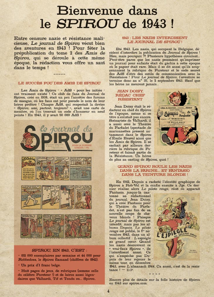 Entre censure nazie et résistance malicieuse, Le journal de Spirou vécut bien des aventures en 1943 ! Pour fêter le début de la prépublication du tome 2 des Amis de Spirou, qui se déroule à cette même époque, la rédaction vous offre, cette semaine, un saut dans le temps !
