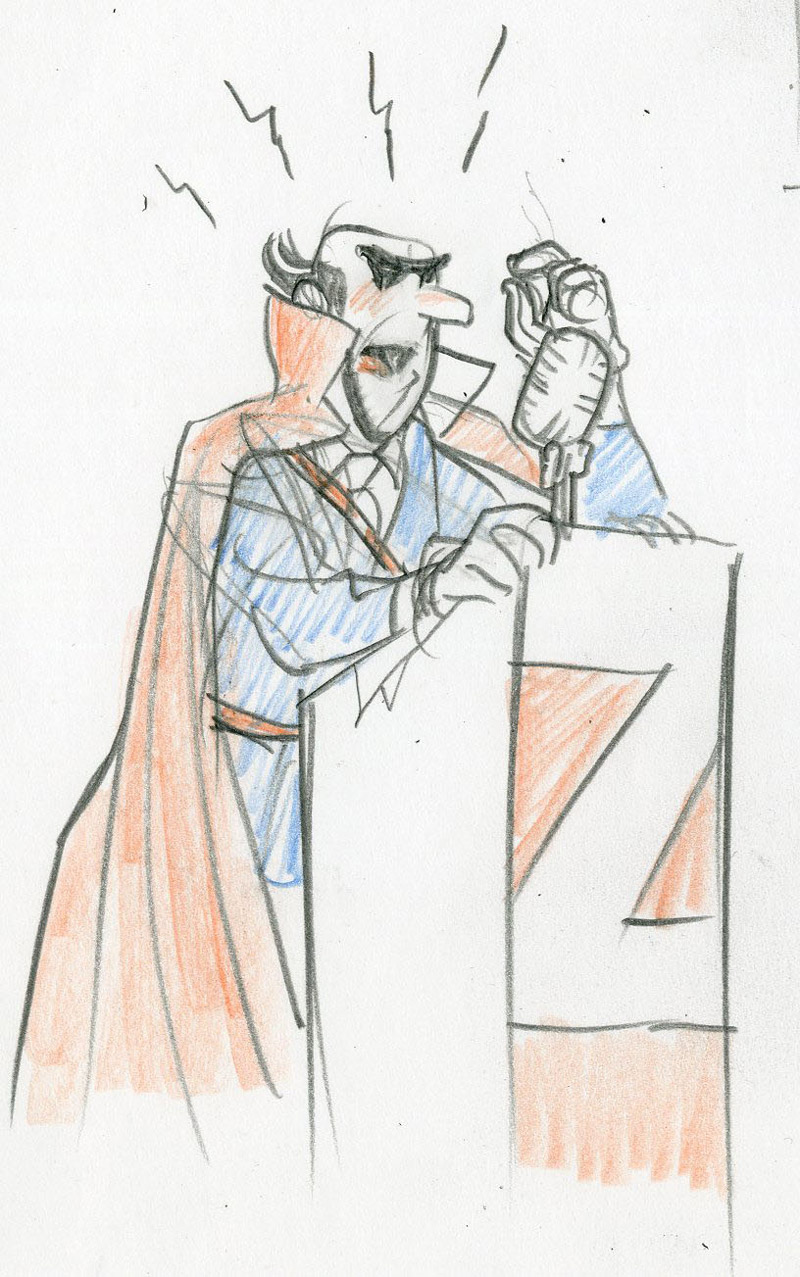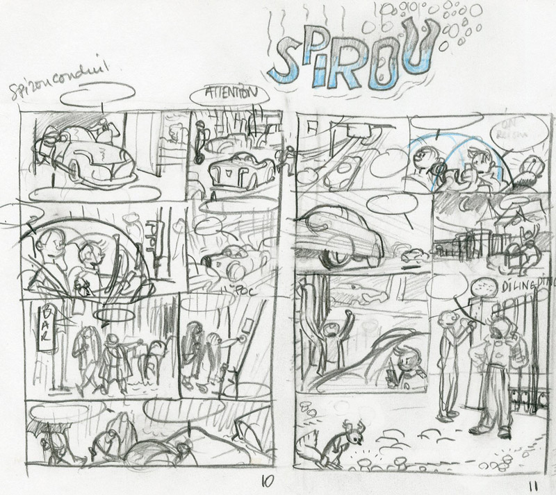 Olivier Schwartz : Champignac, je l’ai bien senti dès le début. J’aime convoquer dans ma tête des gens que je connais ou des acteurs, afin de mieux rentrer dans mes personnages. Ce qui est étrange, c’est que parfois je pense même à plusieurs personnes à la fois, utilisant un nez, une jambe… Il faut croire que Champignac m’a évoqué beaucoup de gens que j’apprécie. Quand je dessine Spirou, je ne pense par contre à personne. Ou plutôt, pour être précis, au Spirou de Franquin et de Chaland.