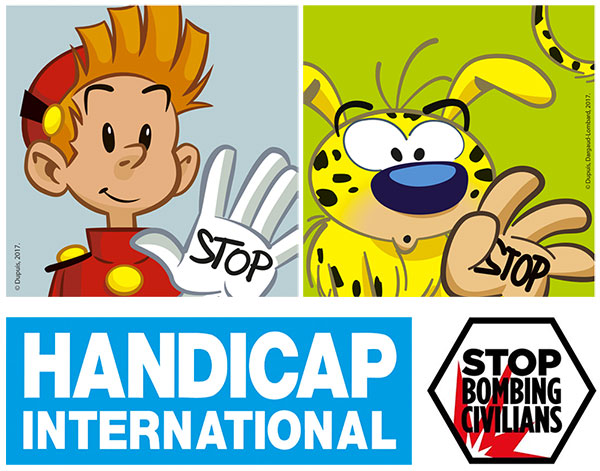 Spirou et Marsupilami s’associent à la campagne d’Handicap International « Stop Bombing Civilians » qui est lancée ce mardi 12 septembre, pour dire non à l’utilisation des armes explosives en zones peuplées.