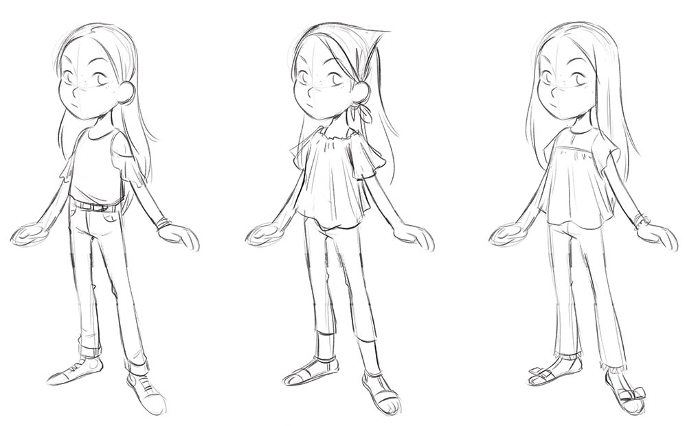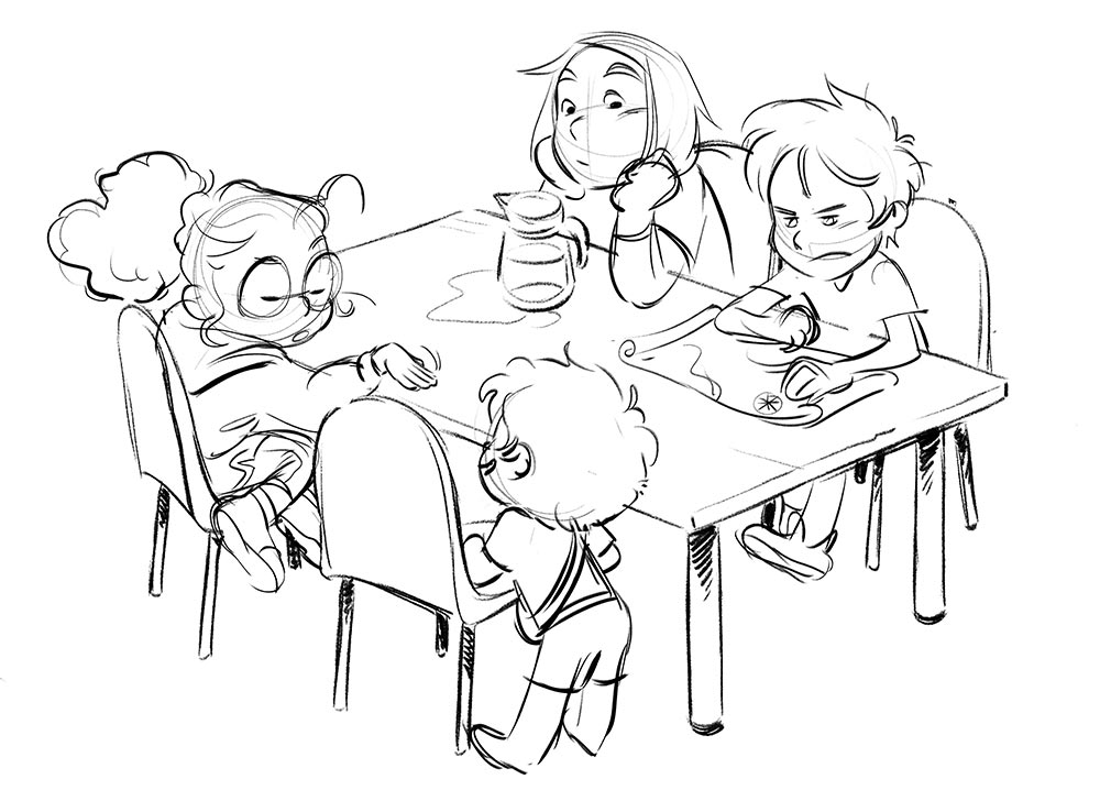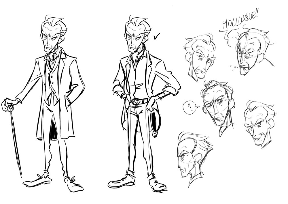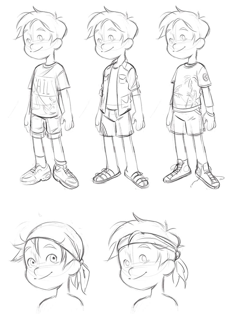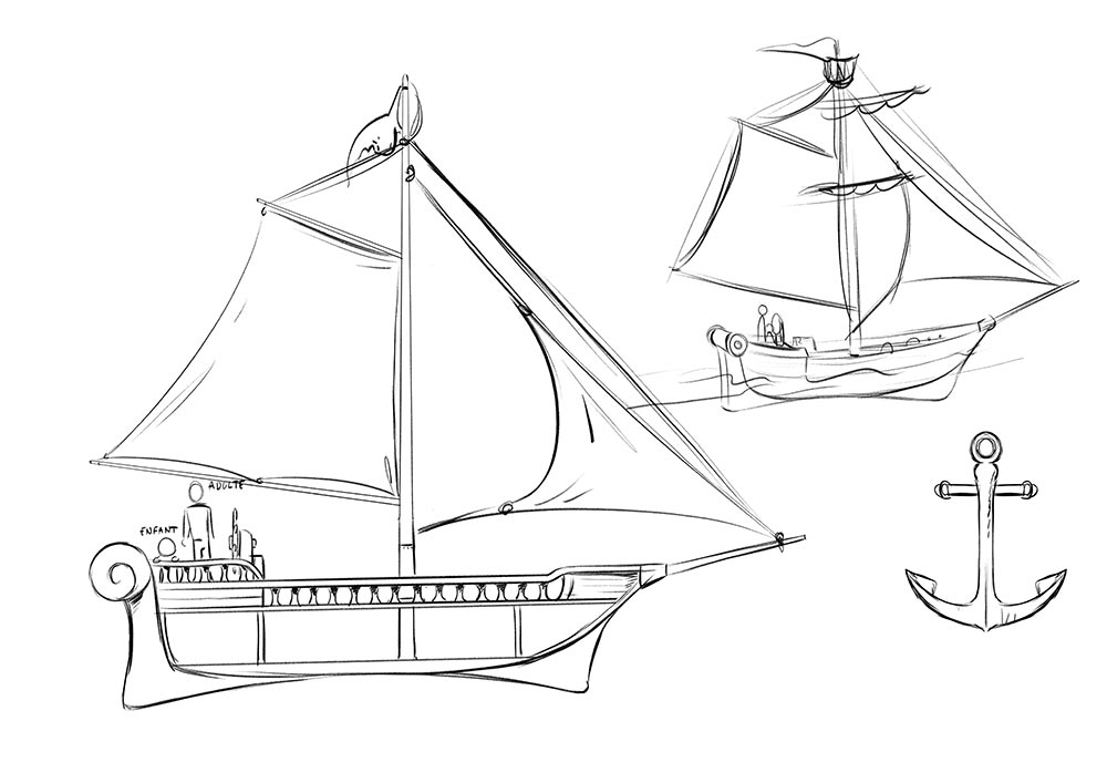 Instagram et Pinterest sont essentiels, pour la recherche d’images. Je cherche et enregistre tout un tas de concept art, de recherches… Une des grandes difficultés de Trésor était de dessiner sous tous les angles Brigantin, son bateau. Heureusement, à l’époque sont sorties plusieurs animés d’aventures maritimes comme Luca de Pixar ou Le monstre des mers sur Netflix, qui ont nourri mon inspiration. Le plus difficile a été de styliser la mer et l’écume. Il fallait que je donne du mouvement et de la vitesse dans une image fixe. Mais c’est un plaisir qu’offre la BD, par rapport à l’animation, que de pouvoir réaliser des designs sans se poser la question de savoir s’ils seront « animables » ou pas.
